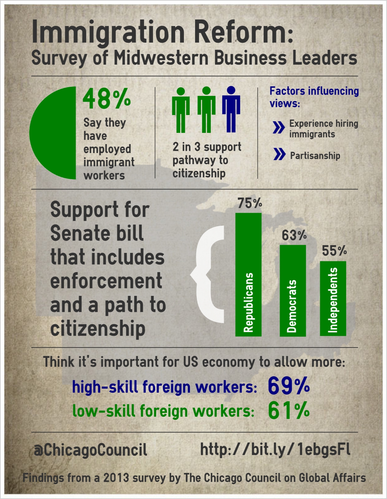 Business leaders across the Midwest overwhelmingly back comprehensive immigration reform. A recent post on Immigration Impact describes the findings from a new Chicago Council on Global Affairs report. On comprehensive immigration reform, the report finds that 65 percent of Midwest business leaders strongly support the Senate’s (S.744) immigration reform bill passed in June 2013. The support for comprehensive reform is bipartisan, and the preference is for legislation that addresses many components of immigration reform rather than addressing individual components in a piecemeal approach. Specifically, 75 percent of Republican business leaders support the Senate’s comprehensive immigration reform bill.
