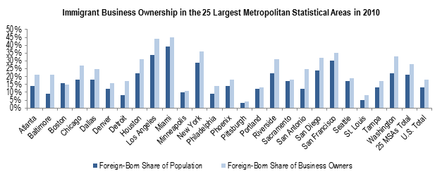 Immigrant business owners represent a sizeable share of all business owners in many metropolitan areas, places that are drivers of regional economies and the economy of the nation as a whole. According to the Fiscal Policy Institute, the immigrant business ownership rate in 2010 was higher than the foreign-born share of total population in many metropolitan areas across the country, as the following examples illustrate.