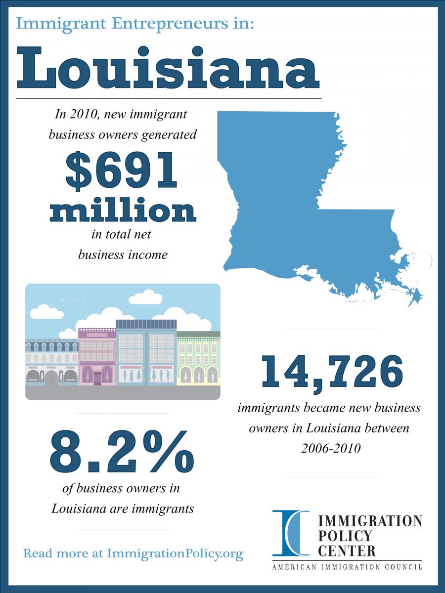 - From 2006 to 2010, there were 14,726 new immigrant business owners in Louisiana, and in 2010, 8.2 percent of all business owners in Louisiana were foreign-born.