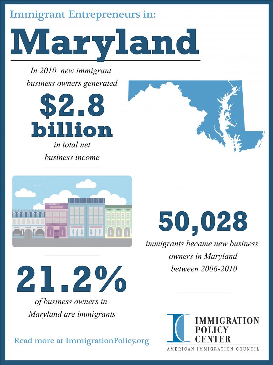 - From 2006 to 2010, there were 50,028 new immigrant business owners in Maryland, and in 2010, 21.2 percent of all business owners in Maryland were foreign-born.