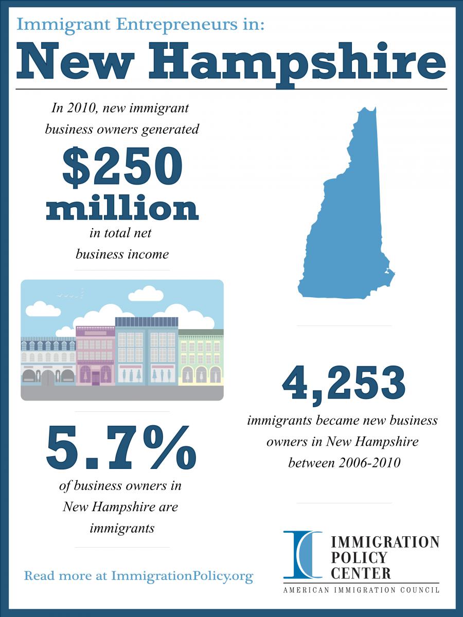 - From 2006 to 2010, there were 4,253 new immigrant business owners in New Hampshire, and in 2010, 5.7 percent of all business owners in New Hampshire were foreign-born.