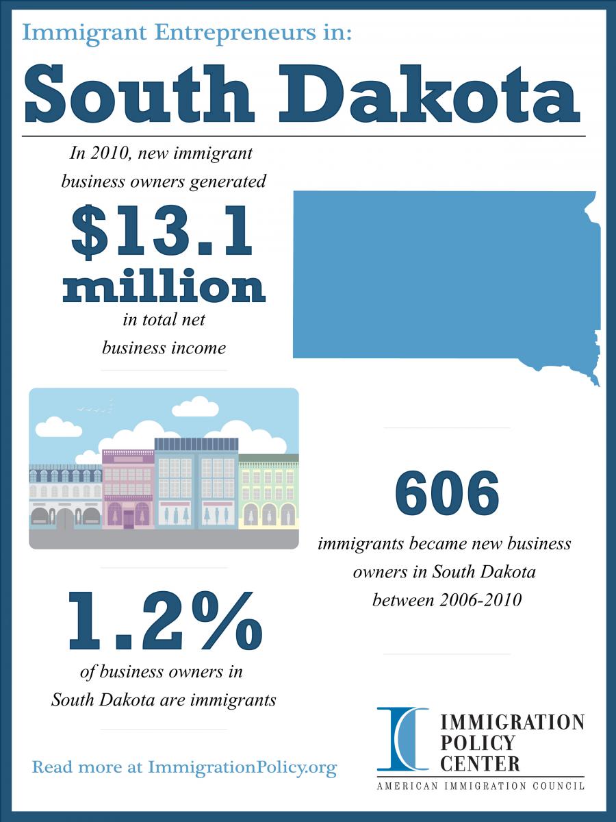 • From 2006 to 2010, there were 606 new immigrant business owners in South Dakota, and in 2010, 1.2 percent of all business owners in South Dakota were foreign-born.