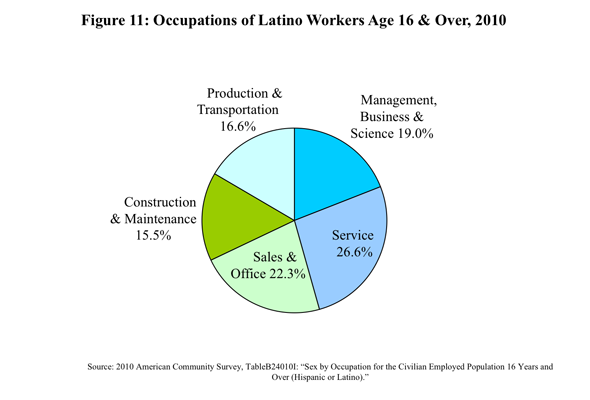 - More than one-quarter (26.6%) of Latino workers age 16 and over worked in service occupations in 2010, followed by sales and office occupations (22.3%), management, business, and science occupations (19%), production and transportation occupations (16.6%), and construction and maintenance occupations (15.5%) {Figure 11}.