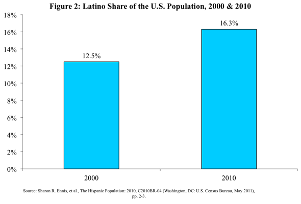 - In 2010, Latinos comprised one-sixth (16.3%) of the total U.S. population—up from 12.5% in 2000 {Figure 2}.
