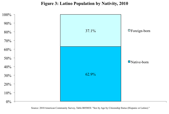 - 62.9% of people who identified themselves as Latino were native-born in 2010 {Figure 3}.