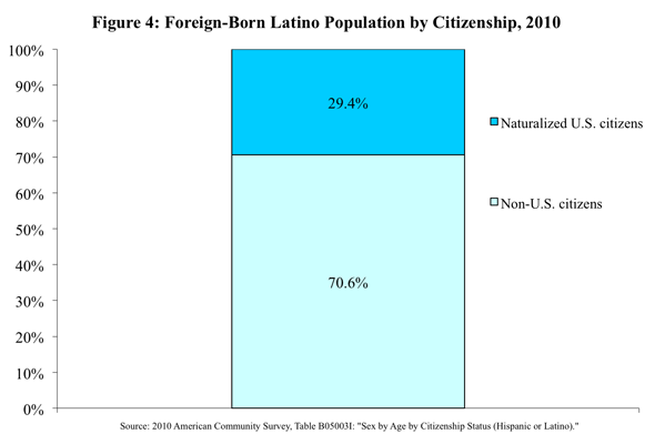- 29.4% of foreign-born Latinos were naturalized U.S. citizens in 2010, meaning that they can vote {Figure 4}.