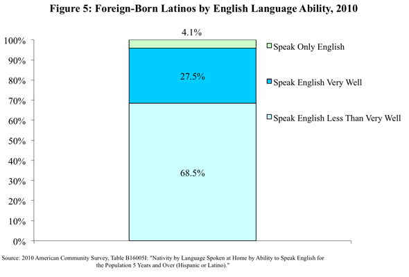 - 31.6% of foreign-born Latinos age five and up reported speaking only English or speaking it “very well” in 2010 {Figure 5}.