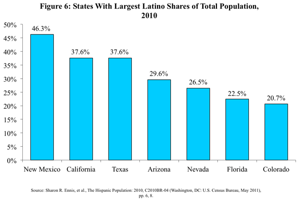 - As of 2010, Latinos comprised 46.3% of the population in New Mexico, 37.6% in California and Texas, 29.6% in Arizona, 26.5% in Nevada, 22.5% in Florida, and 20.7% in Colorado {Figure 6}.