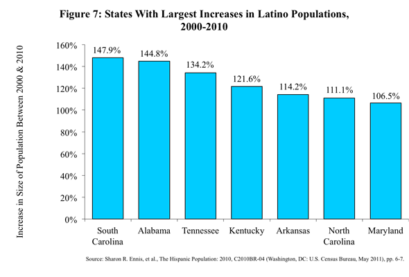 - Between 2000 and 2010, the Latino population increased in size by 147.9% in South Carolina, 144.8% in Alabama, 134.2% in Tennessee, 121.6% in Kentucky, 114.2% in Arkansas, 111.1% in North Carolina, and 106.5% in Maryland {Figure 7}.