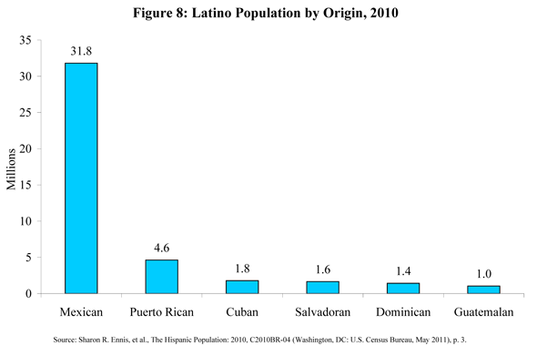 - As of 2010, 31.8 million Latinos identified themselves as being of Mexican origin, 4.6 million Puerto Rican, 1.8 million Cuban, 1.6 million Salvadoran, 1.4 million Dominican, and one million Guatemalan. {Figure 8}