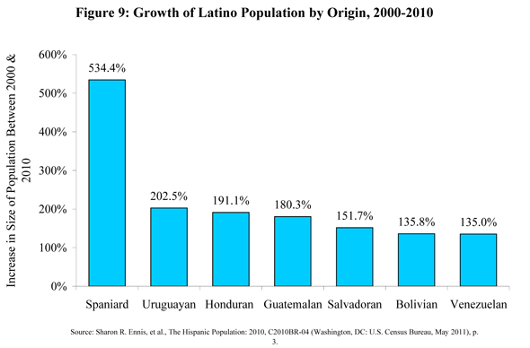 - Between 2000 and 2010, the Spanish population grew by 534.4%, the Uruguayan by 202.5%, the Honduran by 191.1%, the Guatemalan by 180.3%, the Salvadoran by 151.7%, the Bolivian by 135.8%, and the Venezuelan by 135% {Figure 9}.