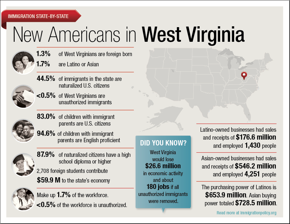 Immigrants, Latinos, and Asians account for growing shares of West Virginia’s population and economy. Immigrants (the foreign-born) make up 1.3% of the state’s population, and nearly half of them are naturalized U.S. citizens who are eligible to vote. Immigrants not only contribute to the state’s economy as workers, but also account for millions of dollars in tax revenue and consumer purchasing power. Moreover, Latinos and Asians (both foreign-born and native-born) wield $1.4 billion in consumer purchasing power, and the businesses they own had sales and receipts of $722.8 million and employed more than 5,600 people at last count. At a time when the economy is still recovering, West Virginia can ill-afford to alienate a significant component of its labor force, tax base, and business community.