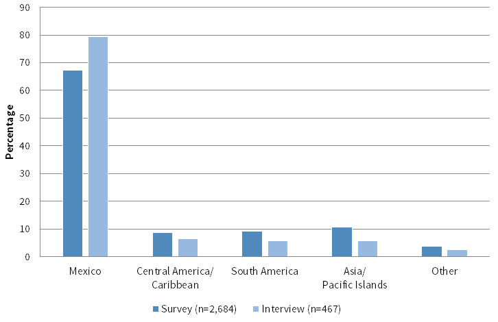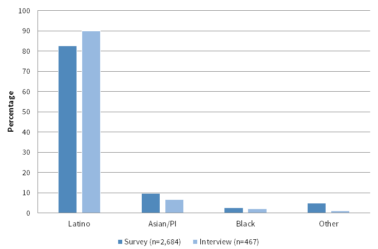 The distributions of both race/ethnicity and country of origin in the interview sample appear quite similar to the distributions in the survey sample. In the interview sample, 79.5 percent were born in Mexico, 6.5 percent were born in Central America and the Caribbean, 5.8 percent were born in South America, 5.8 percent were born in Asia and the Pacific Islands, and the remaining 2.5 percent were born in countries outside of these specified regions. In total, 35 different countries are represented in our interview sample. Additionally, 90.0 percent identify as Latino, 6.7 percent as Asian or Pacific Islander, 2.2 percent as Black, and 1.1 percent as some other race/ethnicity (including white).
