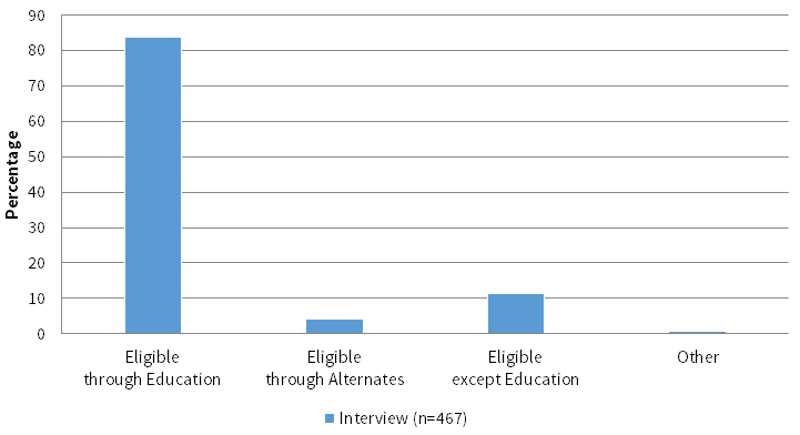 Because our respondents have such diverse educational experiences, they did not all meet the educational requirement included in DACA’s provisions at the time of the President’s announcement in June 2012. At the time of announcement, 83.7 percent of respondents were immediately eligible for DACA through educational qualifications, meaning they were either enrolled in high school or had previously earned either a high school diploma or GED; 4.3 percent of respondents were immediately eligible for DACA through alternate paths, meaning they had completed or were currently enrolled in a DACA-qualifying education program (i.e. a language or literacy program, vocational/career training program, or GED-prep program); finally, 11.3 percent met all eligibility criteria except the educational requirement, meaning they were not enrolled in high school or a DACA-qualifying education program, had not graduated from high school, did not have a GED, and had not completed a DACA-qualifying education program. An additional 0.64 percent were ineligible for DACA due to other requirements, such as being above the 34-year-old age limit or traveling outside of the United States in the last five years.