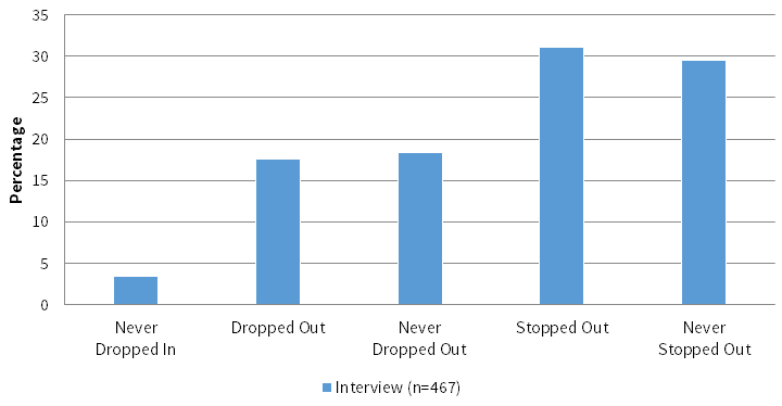 At the time of the survey, 29.0 percent of our respondents had a high school degree or less; 34.6 percent of respondents had attended some college but had not yet obtained a degree; 15.4 percent of respondents had earned an Associate’s degree; and 21.0 percent of respondents had earned a Bachelor’s degree or higher. Of those respondents who had some post-secondary educational experience, 42.3 percent had “stopped out” of college at least once during their trajectory. At the time they left, these “college stop outs” had the intention of returning, whether or not they did end up having the opportunity to do so.