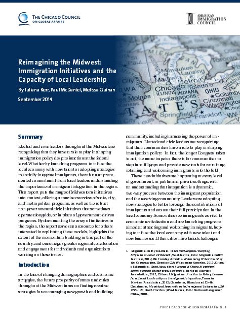 Elected and civic leaders throughout the Midwest are recognizing that they have a role to play in shaping immigration policy despite inaction at the federal level, according to a report released by The Chicago Council on Global Affairs and the American Immigration Council. Whether by launching programs to infuse the local economy with new talent or adopting strategies to socially integrate immigrants, there is an unprecedented commitment from local leaders understanding the importance of immigrant integration in the region. This report puts the range of Midwestern initiatives into context, offering a concise overview of state, city, and metropolitan programs, as well as the robust non-governmental civic initiatives that sometimes operate alongside, or in place of, government-driven programs. By documenting the array of initiatives in the region, the report serves as a resource for others interested in replicating these models, highlights the extent of the momentum building in this part of the country, and encourages greater regional collaboration and engagement for individuals and organizations working on these issues.